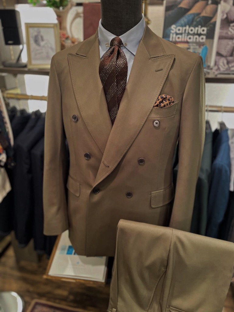 落ち着きのあるブラウンカーキの色味は、クラシックなダブルブレストとの相性も抜群。