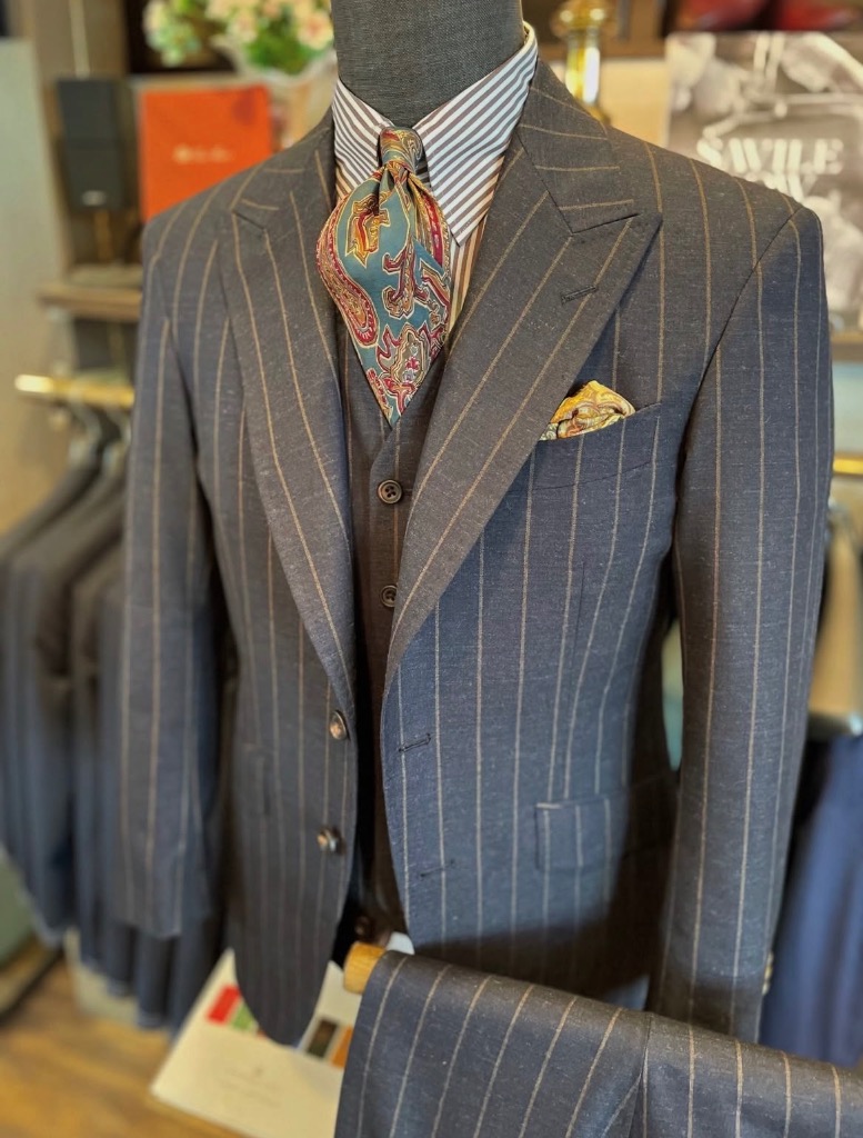 当時のイギリス仕立ては重厚で構築的なスタイルが主流でしたが、温暖な気候のナポリでは、より軽く快適に着られる服が求められました。