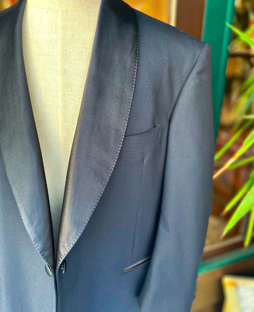 よくオーダーの際、ショールカラーとピークドラペルどちらの方がフォーマルですか?という質問をお受けしますが、どちらも格式高い、クラシックなディテールですので、お好みでお選びいただければと思います。