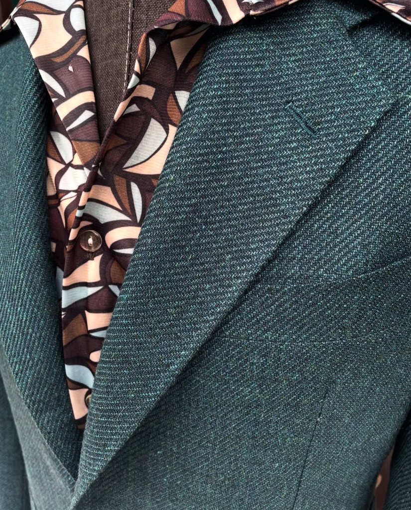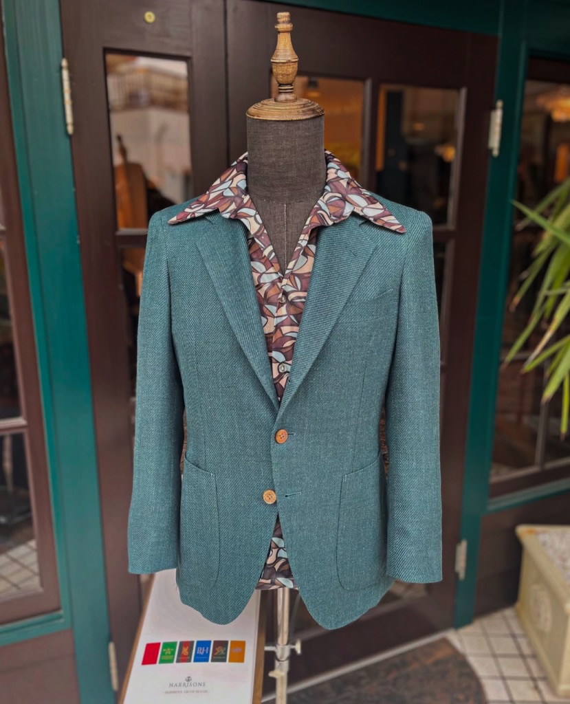 案外グリーン系のジャケットは色合わせがしやすいので、変わり種と1着としてワードローブに加えていただけると良いと思います。