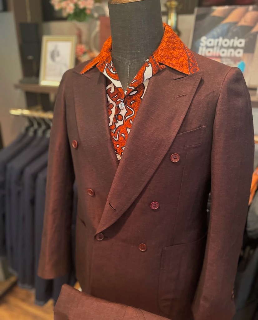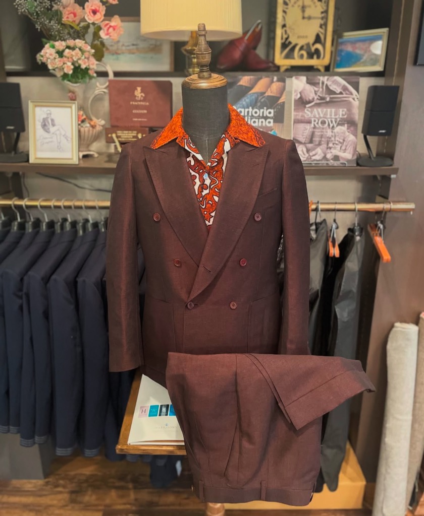 深みのあるバーガンディブラウンのダブルスーツ。