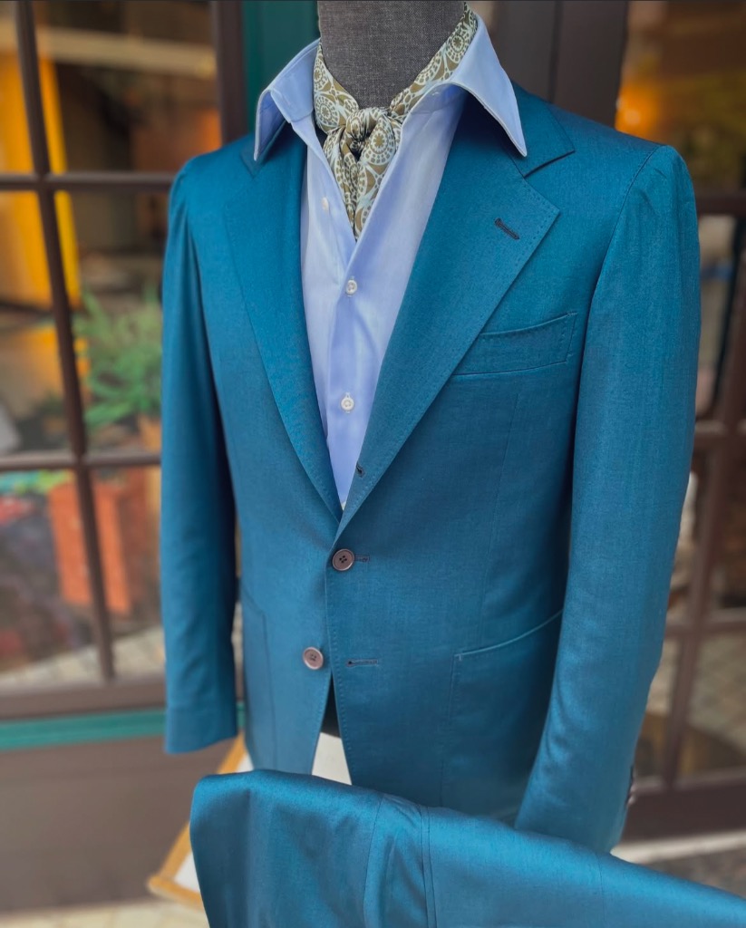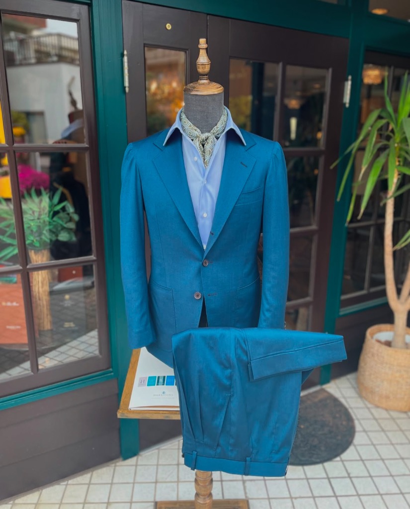 春の陽射しや、夏の風そんな季節の空気感にぴったり寄り添う、軽やかなブルーグリーンスーツ。