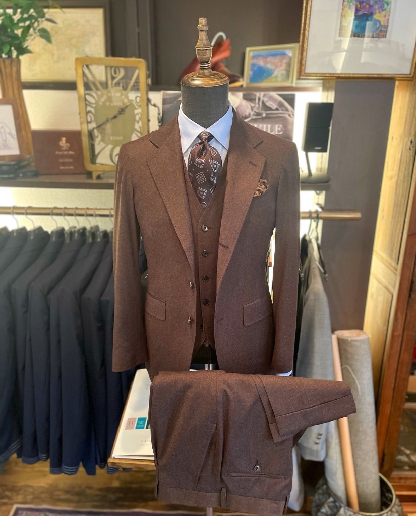 原毛の選定から色出し、細部にまでこだわり抜き、尾州の織屋との共同で織り上げた、当店のオリジナルファブリックを使用した1着。