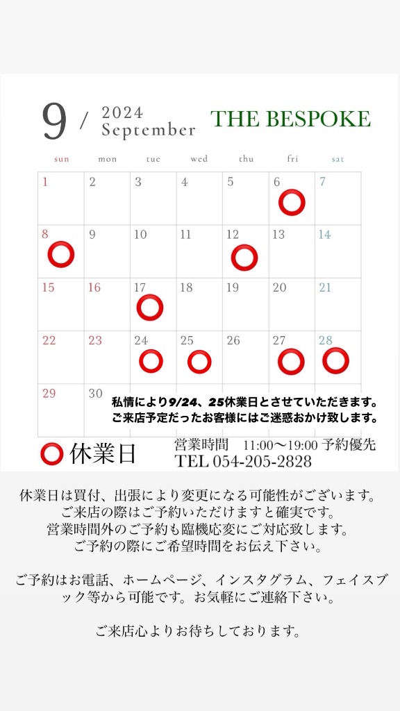 私情により9/24、9/25を休業日とさせていただきます。