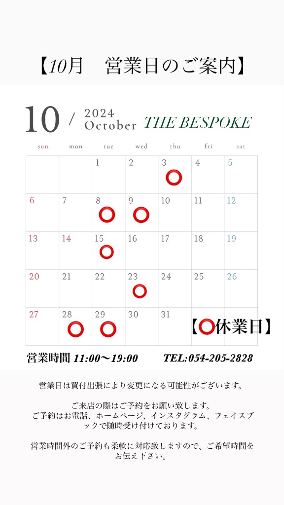 10月 営業日のご案内