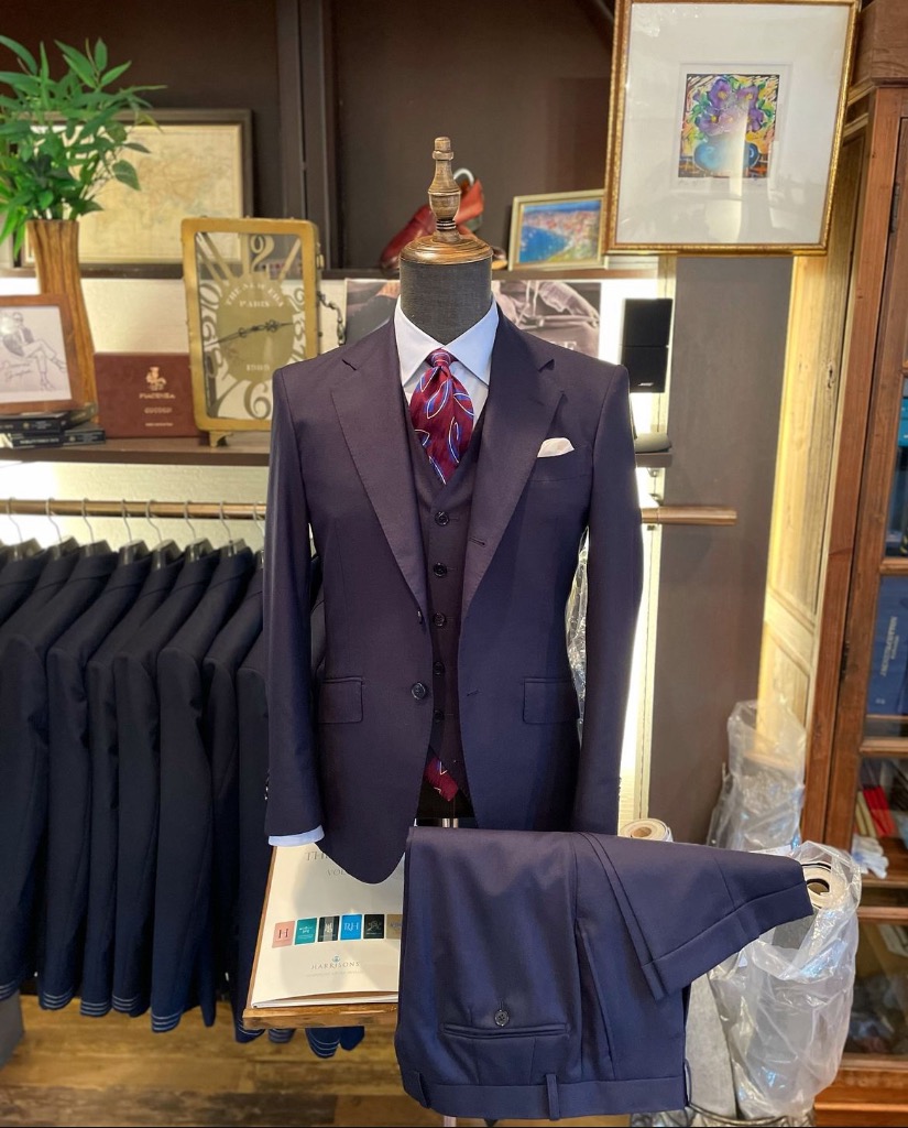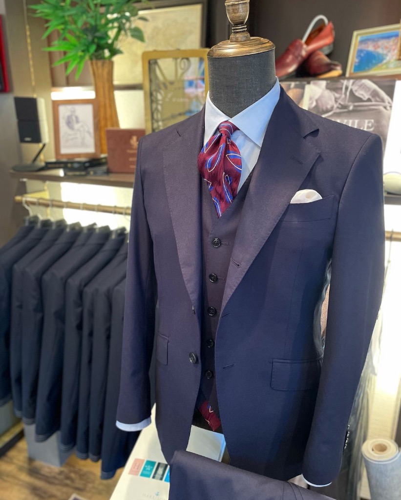 パープルの色味が入る茄子コンは大人のネイビースーツの鉄板です。