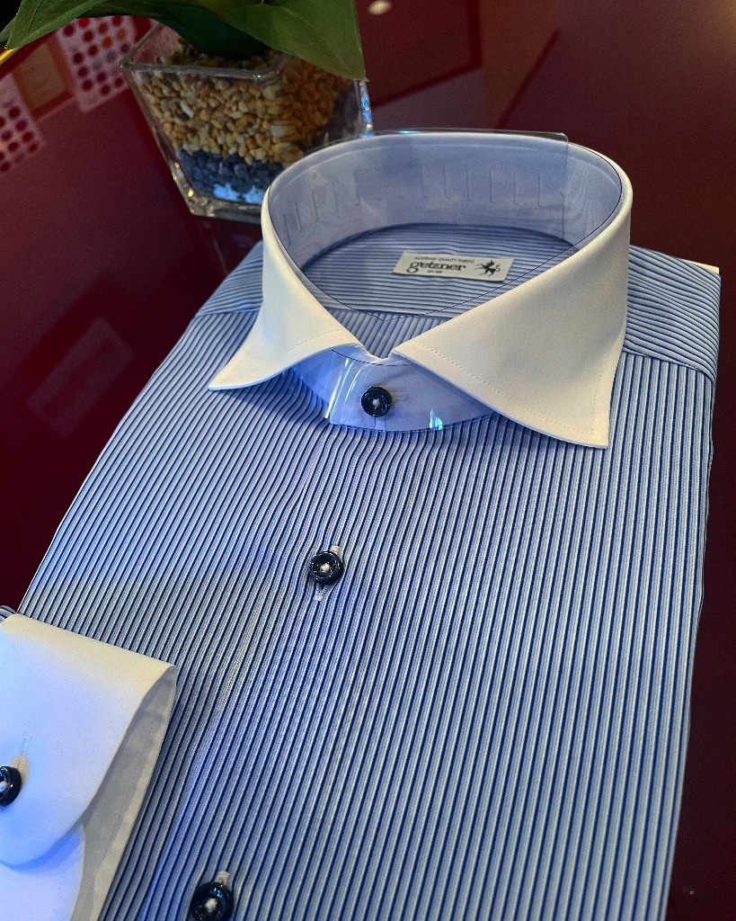 ストライプシャツを使いやすくしたい方は画像のような襟とカフスを白地で作るクレリック仕様がオススメです。こちらも歴史あるクラシカルな仕様なのでカッコよくお召しいただけます。