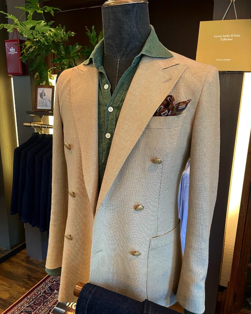 カルロ・バルベラのベージュホップサック生地を使用したオーダーブレザー。