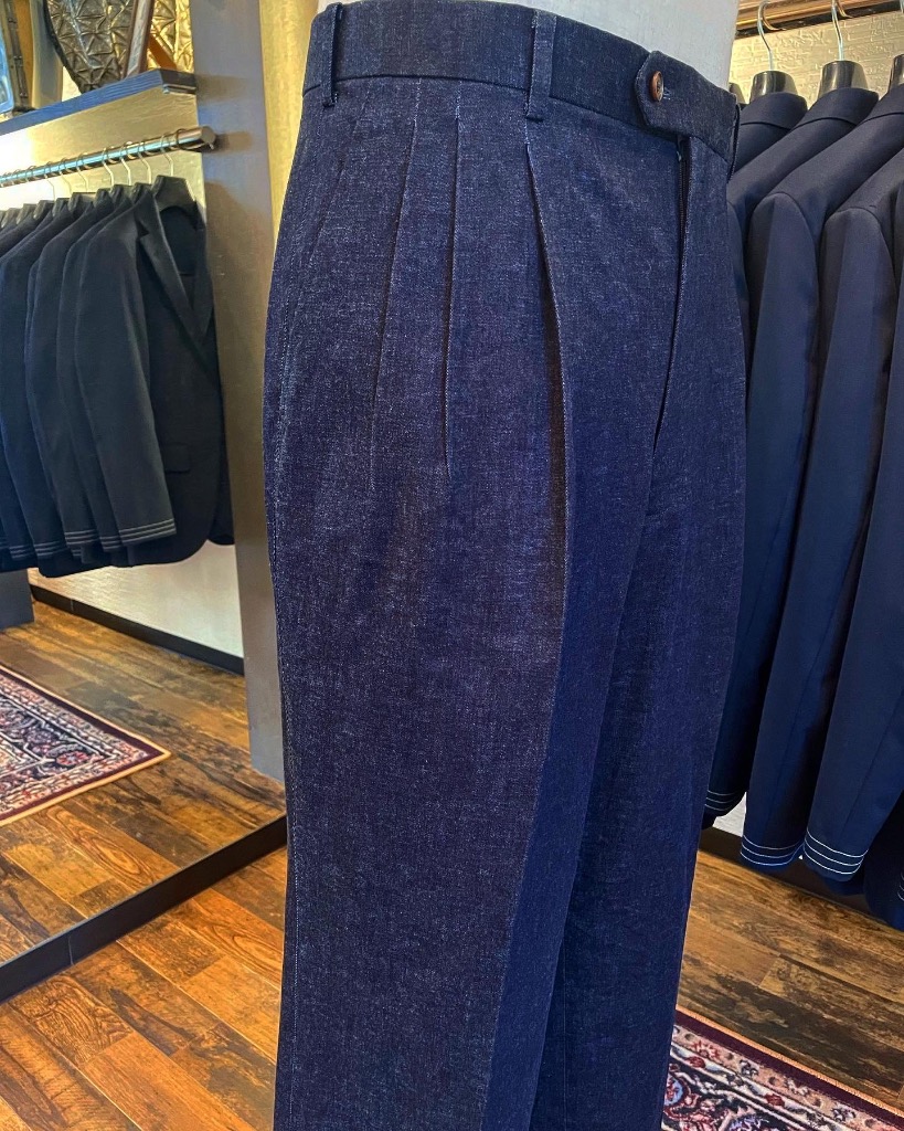 シルエットはワイドテーパードとなっており、プリーツは3本というオーダーでしかお作り頂けないスペシャル使用。