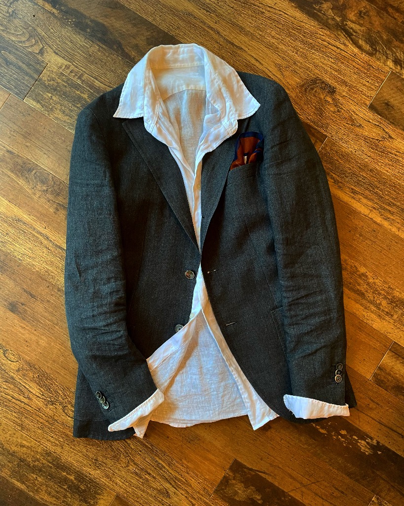 黒リネンジャケット×白リネンシャツ。