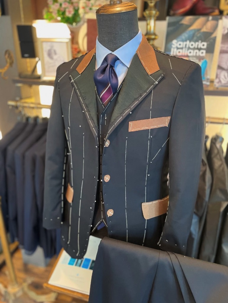 今回ご紹介しているのは、スーツが完成する前の「仮縫い」の段階です。
