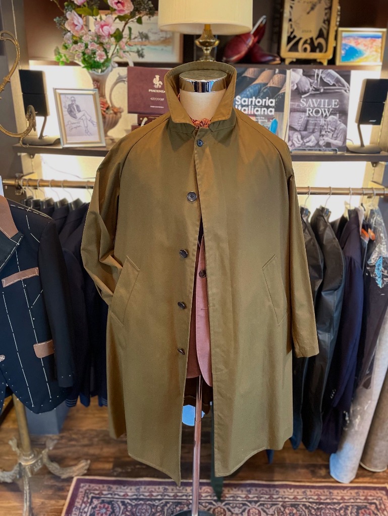 今回ご紹介するのは、オリーブカラーのオイルドギャバジンを使用したラグランスリーブのセミステンカラーコート。